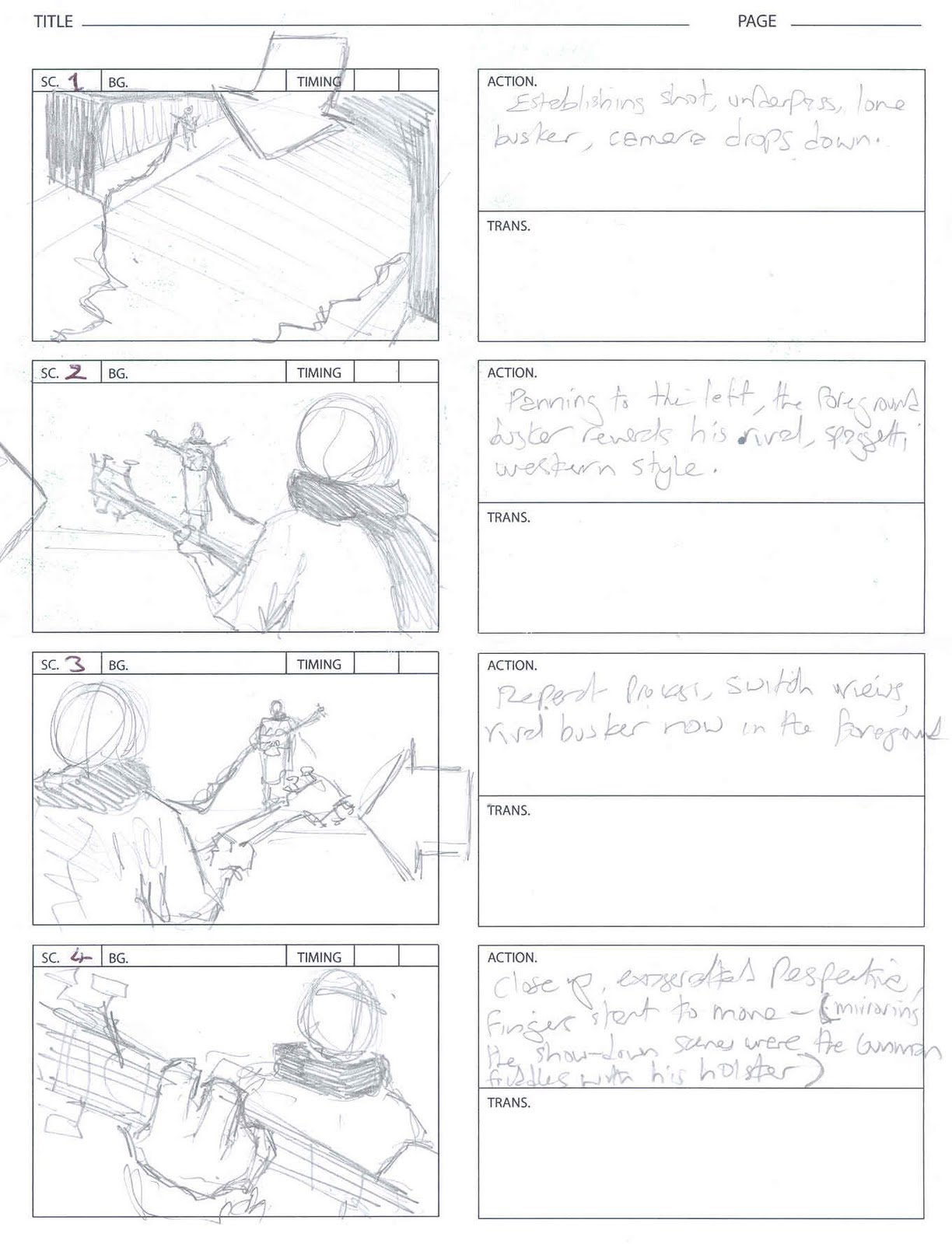 Symmetry plays an important role in this storyboard, as both buskers in their rivalry mirror each other in almost everyway. This is enforced by the scene where both stride across the underpass toward each other agressively. The following scene shows their clash, and again is a close-up, making the drama intimate. The final scene introduces a third party, seen strolling in the background. My composition was crucial here as I needed to shift the focus away from the argument (which at the moment is an eye-catching scenario) and I employed an age-old visual plot device of using the environment or objects, in this case the scarf, as a physical element that draws the eye towards a new focul point, not to mention pushing the bickering pair to the right so as to give wide space to the left for the eye to naturally sweep over at first glance. Very effective.